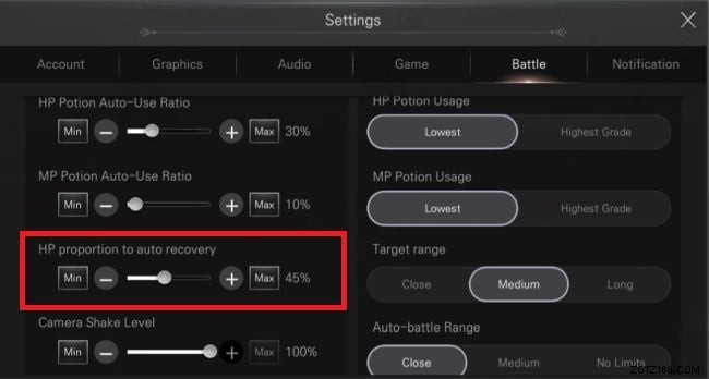 ただし、ヒーリング スキルの場合は少し異なります (写真に表示されている緑色の H です)。体力満タンの状態で回復スキルを使うのはもったいないですよね?したがって、代わりにできることは、キャラクターの健康の%を設定することです(下の図-自動回復に対するHPの割合を参照)。その条件が満たされると、キャラクターは自動的にスキルをキャストします。そこから、HP/MP の使用量と、ターゲットとオートバトルの範囲を調整することもできます。