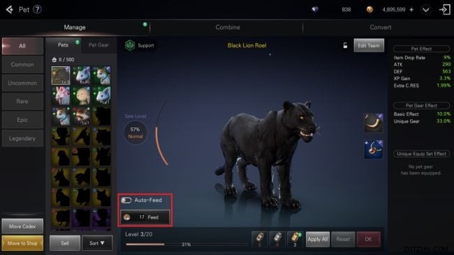また、あなたを助けてキャラクターのステータスを向上させるペットのチームもあります。必ずレベルアップするだけでなく、餌を与え続け、サテのレベルも上げてください。サテレベルがゼロの場合、召喚されたペットのステータスはキャラクターに適用されません。ペットのメニューには、有効にできる自動フィード オプションがあります。これは、キャラクターを自動戦闘に長時間放置することを計画している場合に特に便利です。