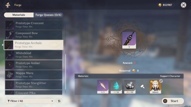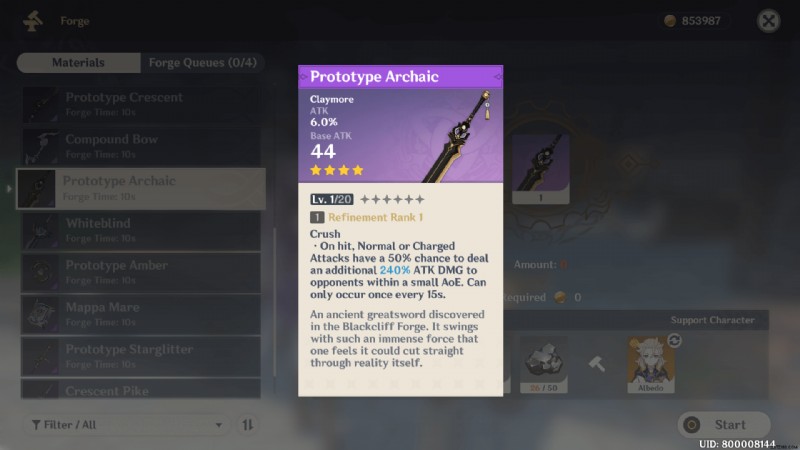 前述のアイテムを集めて、Mondstadt または Liyue の鍛冶屋を訪れ、Prototype Archaic Claymore を作成します。