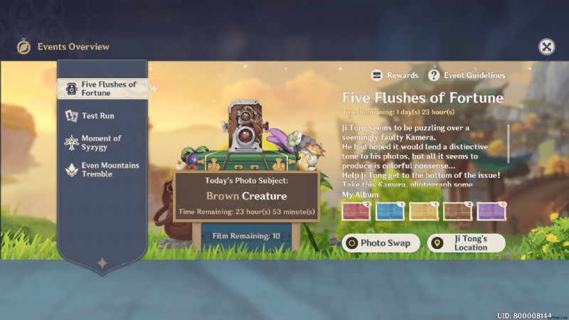 原神インパクト ファイブ フラッシュ オブ フォーチュン イベント 6 日目では、プレイヤーは茶色の生き物の写真を撮る必要があります。他の日と同様に、プレイヤーは 10 枚のカメラ フィルムを補充しています。これは、1 日に合計 10 枚の写真を撮影できることを意味します。そして、Five Flushs of Fortune イベント ガイドで述べたように、Genshin Impact の主な目的 新しいイベントは、5 つの異なる色の写真を集めて、ジ トンと報酬と交換することです。