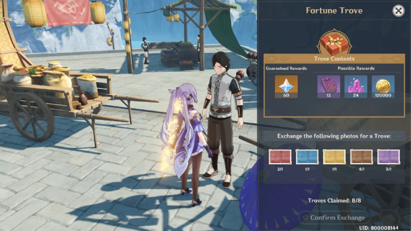 茶色の生き物の写真を 10 枚撮影したら、Ji Tong に戻り、カラー カードを Fortune Trove と交換して、無料の Primogems やその他の報酬を獲得します。