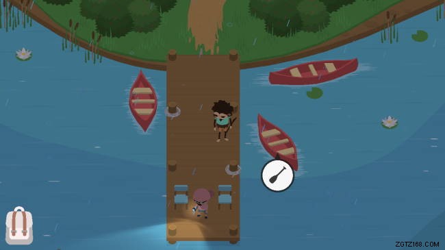 湖では、ドックに到達するまで道をたどります。近くに空のカヌーがたくさんあるので、1 つに近づいて乗り込みます。真っ直ぐ南に漕ぎ始めると、最終的に下に続く道で岸に着きます。