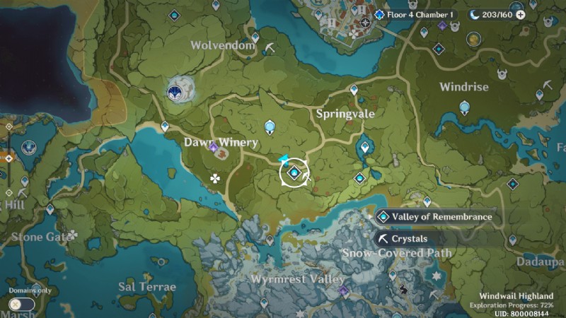 Valley of Remembrance ドメインに移動し、Hilichurl タワーに向かってジャンプします。そこでプレイヤーはCrystalflyを見つけます。そして、この地域は、Crystal Core を得るために Crystalfly を養殖するのに最適な場所の 1 つです。Dawn Winery、Wolvendom、Springvale の間の地域には 10 ~ 14 個以上の Crystalfly があるからです。