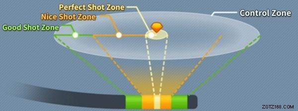 コントロール ゾーン の広い円 良いショット (キャリー + ラン) に基づいて、ボールの最終着地点を計算して表示します )。パーフェクトを打った場合、ボールは円の中心に着地します。