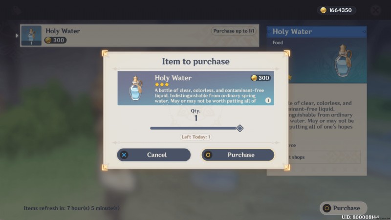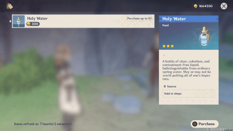 原神インパクト プレイヤーは ホプキンス から 300 モーラで聖水を購入できます スプリングベールで 6:00 ~ 19:00。他のリストされている販売アイテムと同様に、聖水も数量限定で入手できます。プレイヤーは毎日 1 本の聖水しか購入できません。