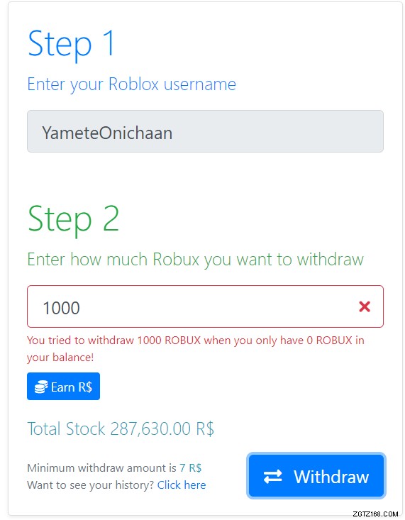十分な数の無料のRobuxを蓄積したら. [出金] タブに移動し、ステップ 2 で貯めた金額を記載します。それが完了したら、[撤回] をクリックすると、無料の Robux が Roblox アカウントに転送されます。