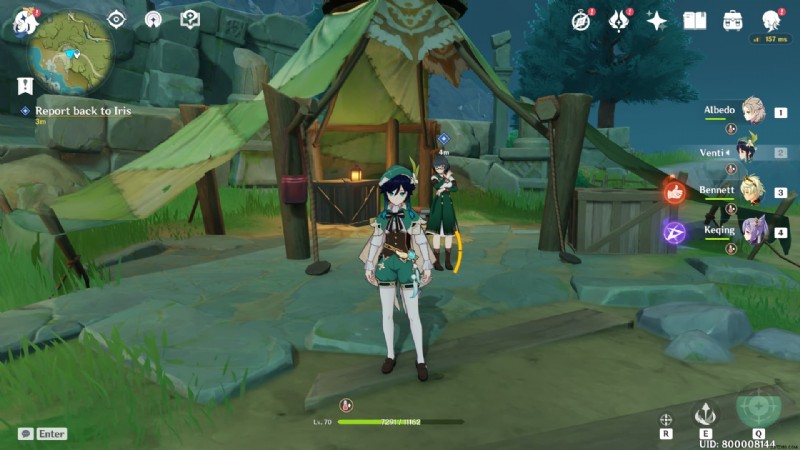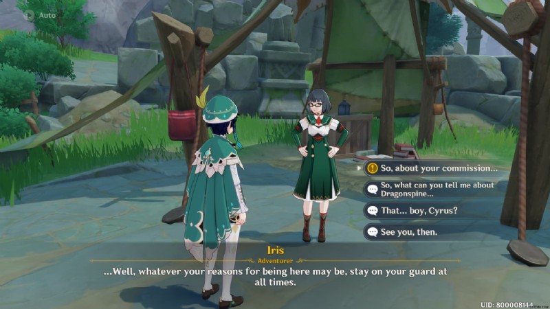 Cyrus との会話が終わると、Iris に戻るように求められます。アドベンチャー キャンプに戻り、アイリスに話しかけて、Windblume の冒険者のクエストを完了します。