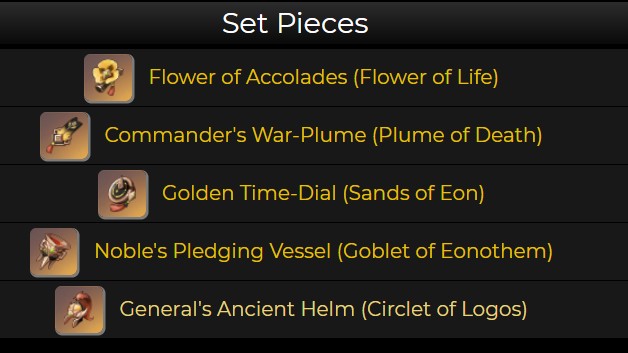 - 4 セット ボーナス – エレメンタルスキルヒット時、3秒間パーティ全体の攻撃力20%、シールド威力20/30%アップこの効果は、1 スタックあたり 0.5 秒間スタックすることができます。