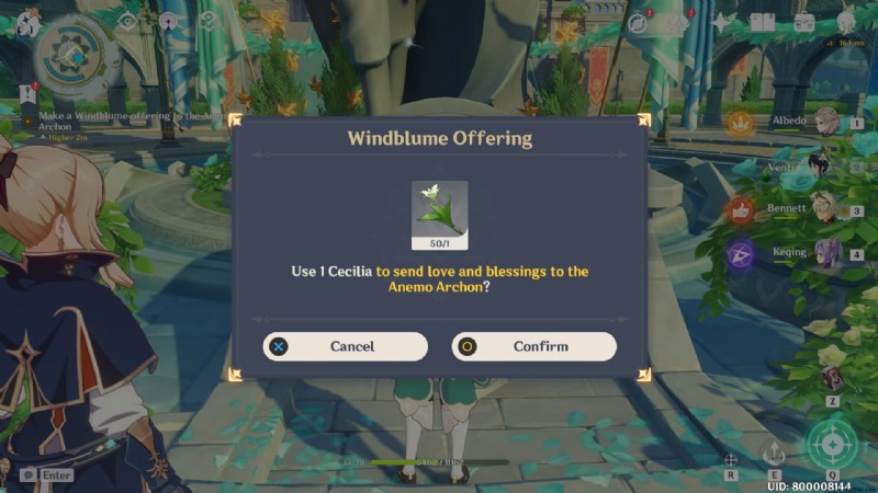 先に述べたように、ジャンと話した後。彼女は花のリストを提供し、その中から 1 つを選択して Anemo Archon に提供します。クエストに影響を与えないので、どんな花でも構いません。私にとっては、Venti の主要なアセンション マテリアルの 1 つであるため、Cecilia を使用しました。