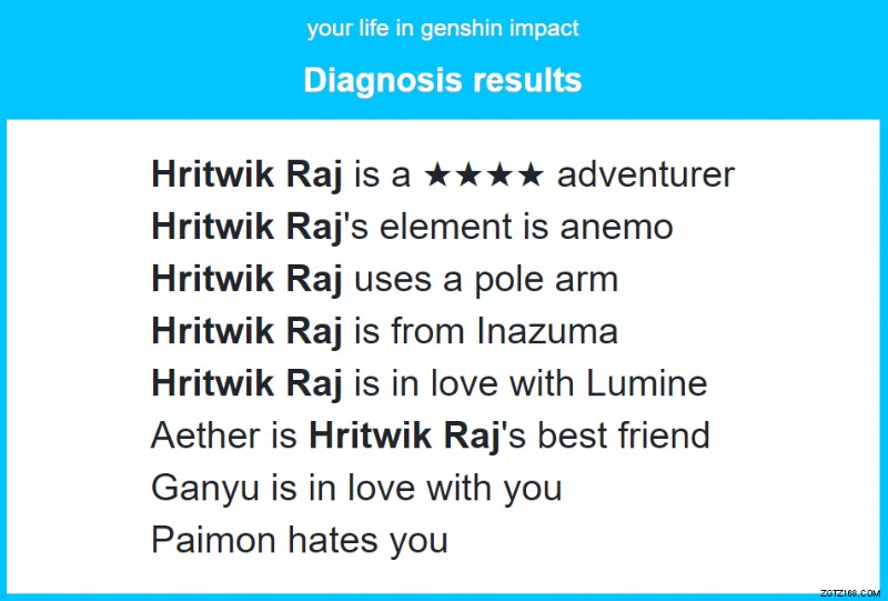 Genshin Impact の他の多くのコミュニティ製ミニゲームと同様に 、プレイヤーはクイズ/ミニゲームのページに移動し、指定されたフィールドに自分の名前を入力し、診断をクリックして結果を確認できます。