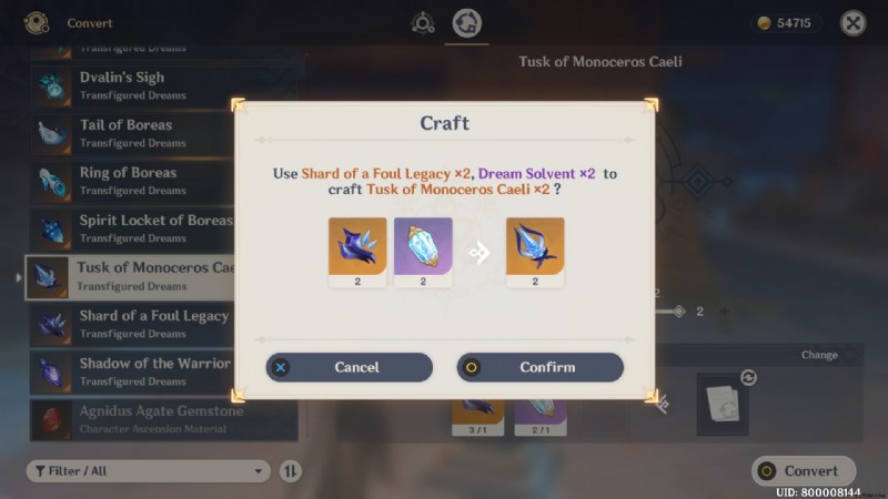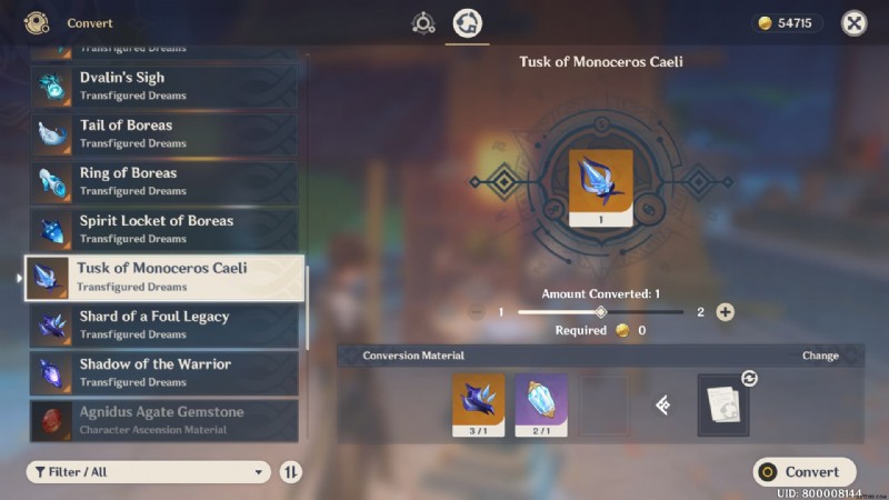 注: 同じボスからのドロップのみ、別のフォームに変換できます。 Monoceros Caeli (Childe ウィークリー ボス報酬) を取得したい。ファウル レガシーの破片を使用する必要があります (Childe の毎週のボス戦からの別の報酬)。