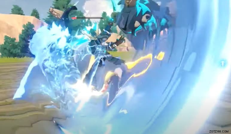この攻撃では、マグー ケンキがカタナを鞘に納め、アネモ エレメントで突進し、幅の広い水平方向のソード スラッシュを放ちます。