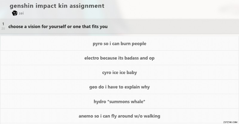 全部で 20 の質問があり、その多くは原神インパクトに関連しています。 、あなたの性格に関連するものもあります。それらに正しく答えると、最後にGenshin Impactを取得できます キャラクター。