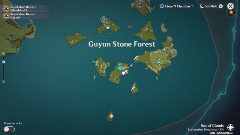 グユン ストーン フォレストは、ルイン ガードから材料を集めるのに最適な場所の 1 つです。プレイヤーは、1 つの場所で 4 つの廃墟の警備員を見つけることができます。上の地図に示されているように、プレイヤー アイコンの場所に移動するだけです。