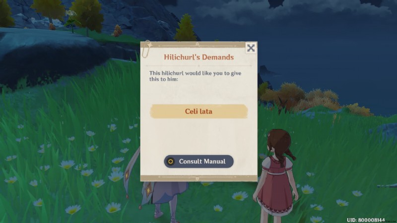 マークされた場所で他の Hilichurl と話します。彼の会話を使い果たすと、彼はアイテム 「Celi lata」 を手に入れるように依頼します。 訳すと「ホタル、星、月など」 .