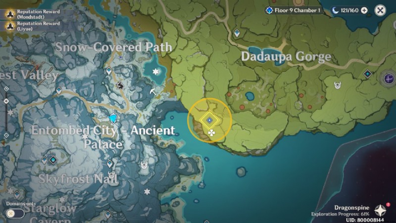 では、2 番目の Hilichurl と話をして Unusual Hilichurl の場所の手がかりを得る時が来ました。 2 番目の Hilichurl は、Dadaupa Gorge を覆う山にあります。 .その場所に到達する最善の方法は、Dragonspine Statue of Seven にテレポートすることです。 その後、マークされた場所まで滑空します .