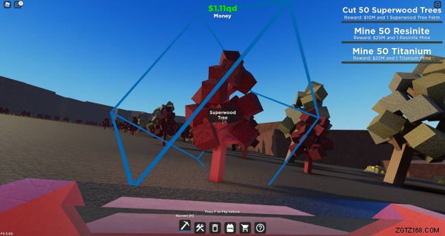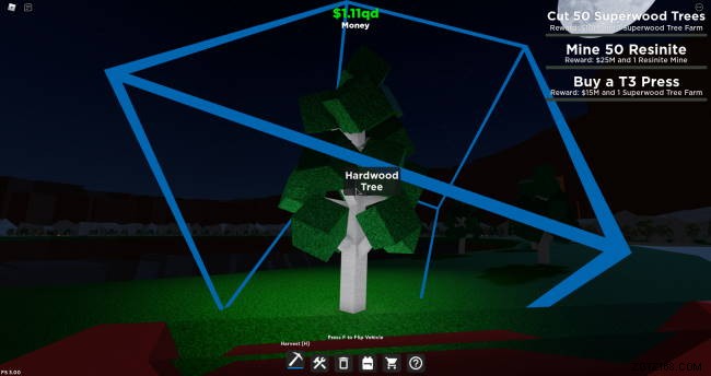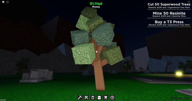 いつもの日常の木。これらは開始エリア全体にあり、通常は基地のすぐ隣にあります。 50 本の木を収穫すると、少額のお金とツリー ファームが手に入ります。
