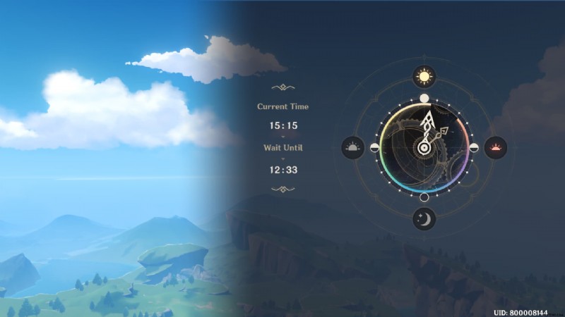 他のユーザーが Square に表示されるまでの待ち時間は、現在のゲーム内時間によって異なります。現在の時間が 12:00 未満の場合 時計を合わせる 12:00 から 18:00 の間はクエストを進行できません .翌日会うように言われるので、パイモンのメニューからゲーム内時計を使って翌日に早送りする必要があります。 .