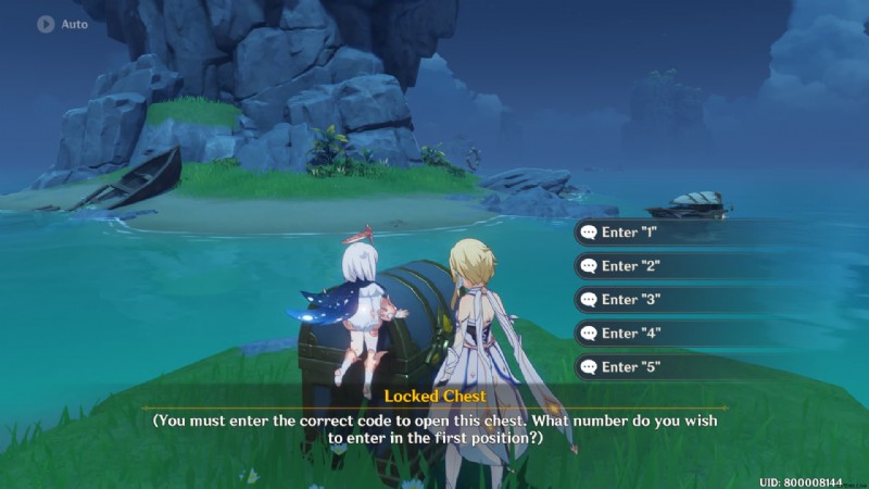 双子の島の鍵のかかった宝箱を開ける正しいコードは 5214 です .ロックされたチェストに初めて遭遇したとき、パイモンはヒントのためにエコーするコンチを確認するように指示します.