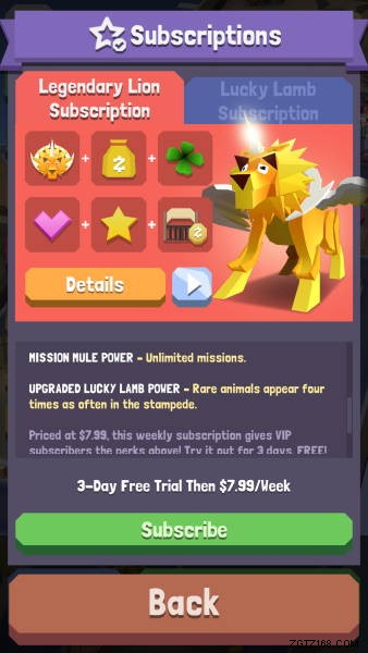 さらに、実際のお金を払いたい場合は、サブスクリプションで珍しい動物のスポーンが増えます.レジェンダリー ライオンのサブスクリプションでは、レアな動物に遭遇するチャンスが通常の 4 倍になり、ラッキー ラムのサブスクリプションではチャンスが 2 倍になります (既にラッキー ラムを所有している場合は 3 倍)。