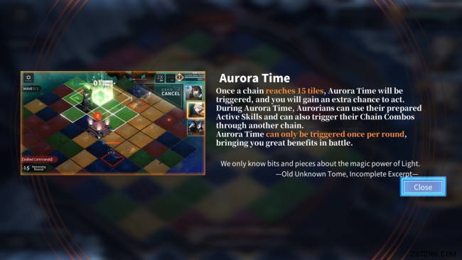 ゲームを進めていくと、より多くのメカニズムが紹介されます。そのようなメカニズムの 1 つが「オーロラ タイム」で、これは少なくとも 15 タイルのチェーンを完了するとトリガーされます。オーロラ タイムはチームに余分なターンを与え、アクティブなスキルを再び使用できるようにするため、大きなアドバンテージが得られます。