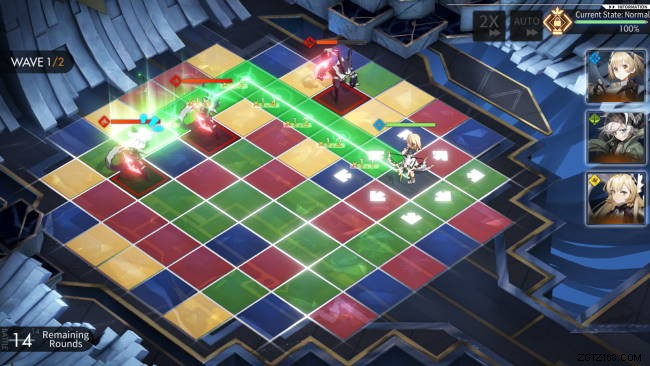 これがAlchemy Starsの戦場です のように見えます。いたるところに色とりどりのタイルがあり、船長から始まる 1 つの色のルートを見つけなければなりません。ルートを見つけたら、指で線を引くと、船長のオーロリアンがルートに触れているすべての敵を攻撃します。