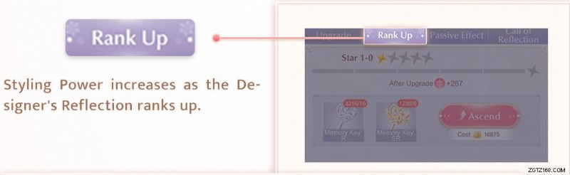 Designer の Reflection メニューに移動し、[Rank Up] タブを選択します。そこでは、付与されたデザイナーの反射をランクアップすることができ、昇格するためのランクアップ素材があります。ランクを上げると、コインとメモリー キーが必要になります。しかし、代わりにスタイリング力が高まります。