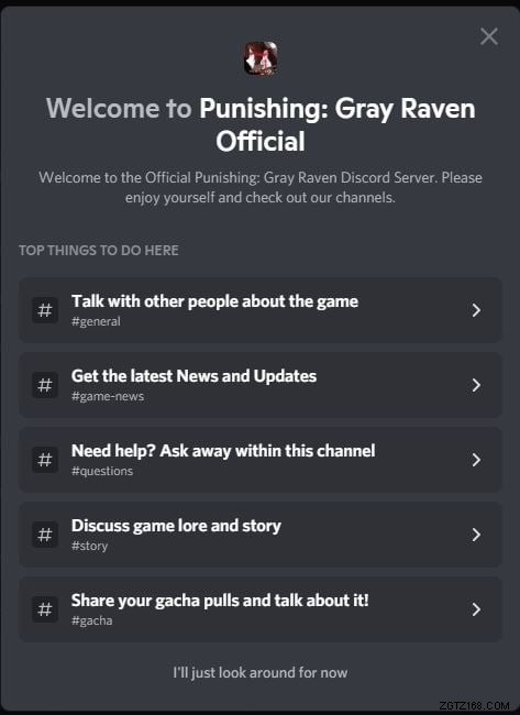 または、最後のオプション「今は見回すだけです」を選択して、パニッシング:グレイ レイヴンを探索することもできます。 あなた自身の公式Discordチャンネル。