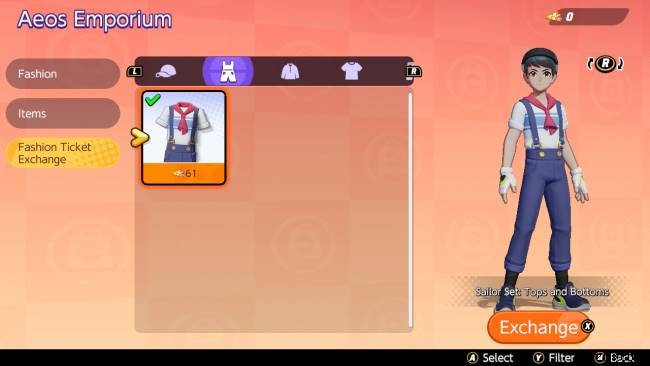 ファッション チケットは 1 か所でのみ使用できます。それが Aeos Emporium です。そこに向かうと、左側に3つのタブが表示されます.Fashion Ticket Exchangeが必要です.ここでは、ファッション チケットをトレーナーの特定の服と交換できます。ここの衣料品の中には最大 60 枚のファッション チケットが必要なものもあるので、節約を始めたほうがいいでしょう!