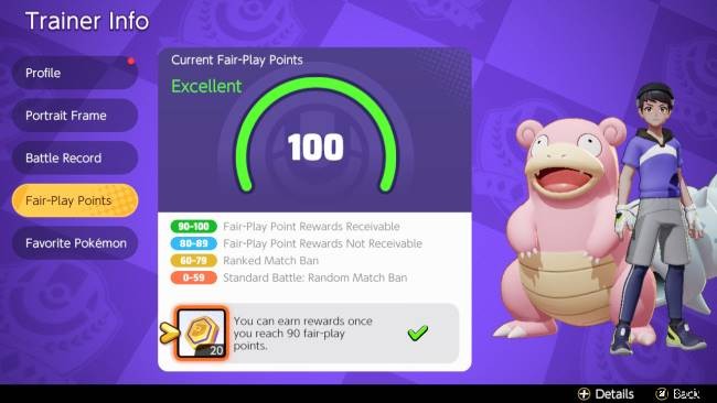 フェア プレイ ポイントは基本的に、プレイヤーがゲームをプレイするすべての人に対して物事を公平に保つためのスポーツマンシップの尺度です。すべての新しいトレーナーは、最大 100 の Fair Play Points から始めます。トレーナー プロフィールでフェア プレイ ポイントを確認できます。