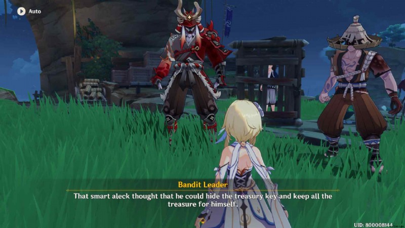 西門次郎の嘘をつきつけるために戻ってみると、またもや逮捕されてしまう。バンディットのリーダーは、次郎がどのように彼らを騙したかなどを教えてくれます。彼らの対話を使い果たしたら、盗賊とファトゥイを倒してください。