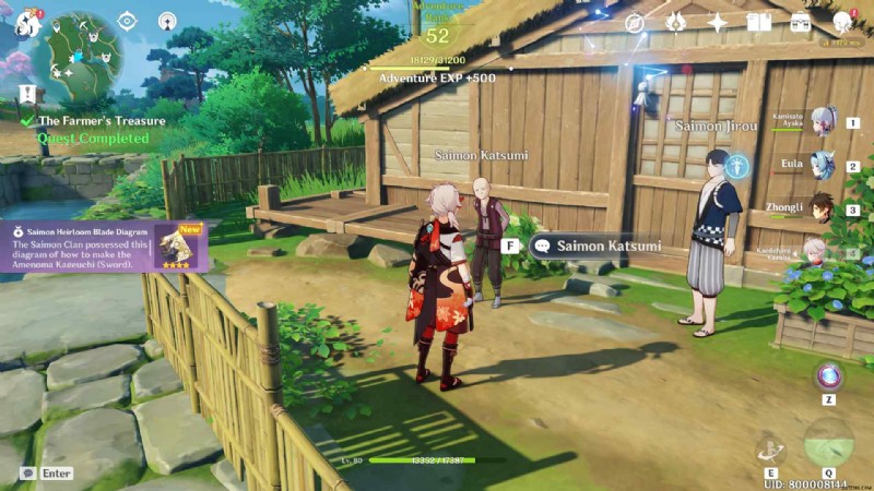 今田村に戻り、西門勝巳に話しかける。次郎と勝美との一連の会話の後。プレイヤーはファーマーズ トレジャー クエストを完了します。