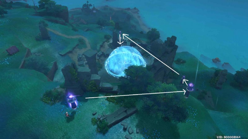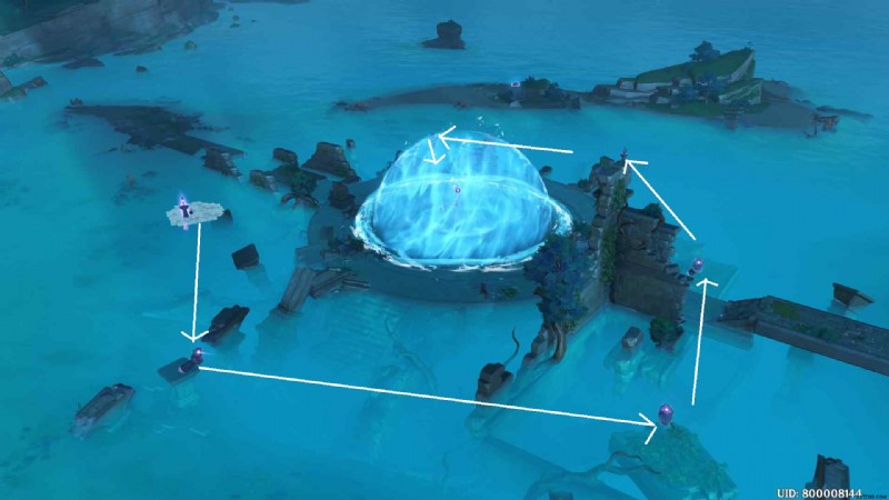 Sacred Stone Mound を最寄りの Thunderbearer Mirror に向け、上のスクリーンショットに示されているパターンに従います。鏡を正しい順番にセットしたら、聖石塚を叩いて水の結界を解いていきます。