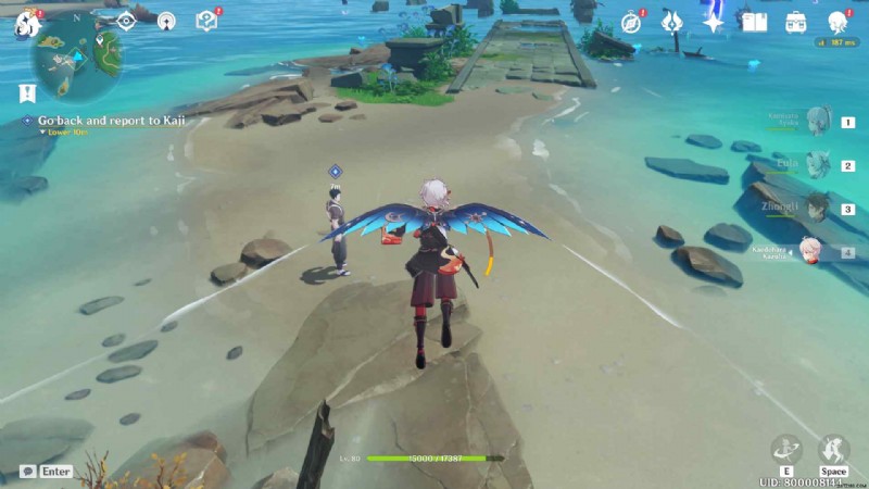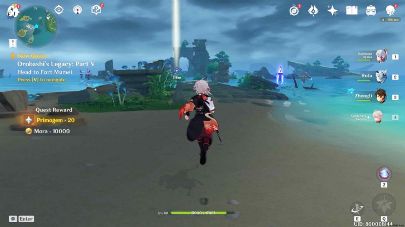 オロバシレガシークエストの第4部では、プレイヤーは戻ってカジに報告する必要があります.彼は、第 3 の島の西側にある無名砦の近くで見つかります。