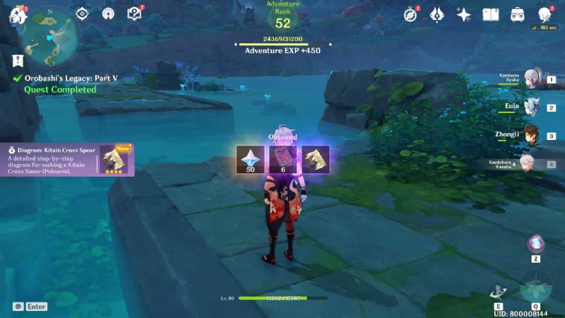 オラバシ レガシー ワールド クエストを完了するには、プレイヤーはオラバシ レガシーの 5 つのパートすべてを完了する必要があります。それが完了すると、プレイヤーはオロバシ レガシー ワールド クエストを正常に完了し、キタン クロス スピアの設計図を取得します。
