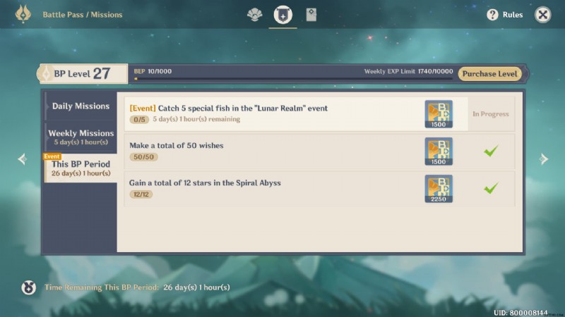 いつものように、新しいイベントが発生すると、イベントに関連するバトル パス チャレンジも発生します。プレイヤーはこれを完了すると、バトル パスの経験値を大量に獲得できます。今回は「『月の世界』イベントでスペシャルな魚を5匹釣る」に挑戦です。