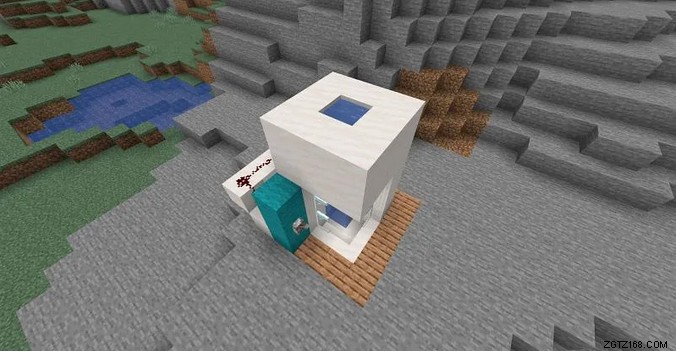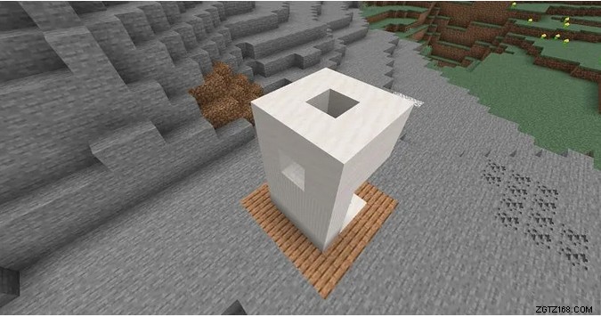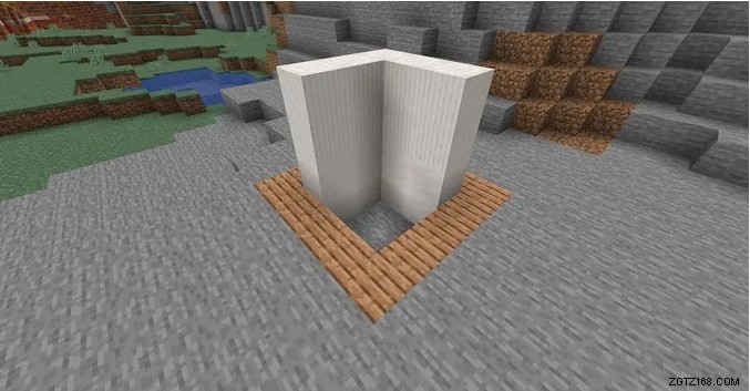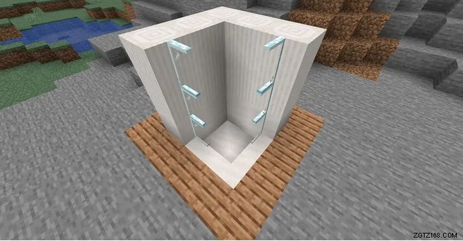 次に、土台の周りに滑らかな石英の階段を 3 つ置きます。 .ブロックスペースが残ります。 そこに滑らかな石英スラブを 1 つ置くだけです . 窓ガラスを設定できるようになりました;彼らはあなたの出入り口として機能します。