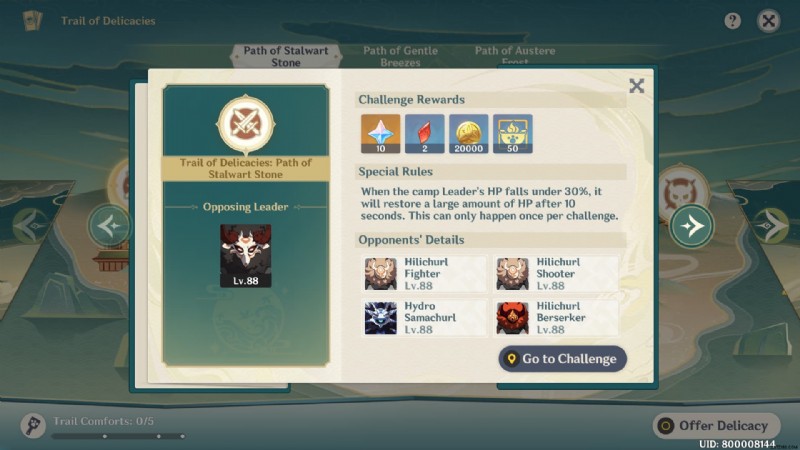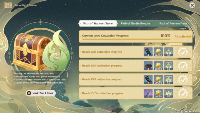 この記事を書いている時点で、プレイヤーは 550 ムーンチェイス フェスティバル フェスティブ フィーバーを獲得できます。200 はムーンライト シーカー セクションの堅固な石の道を 100% 完了することで、350 は美食の道セクションの下の小競り合いを完了することで獲得できます。