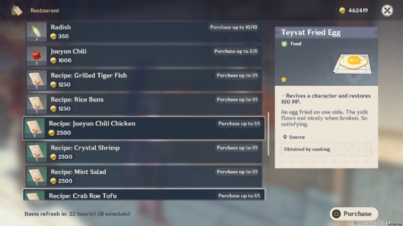 それが完了したら、プレイヤーは万民レストランに行き、マオシェフと話すことができます (シャンリンのお父さん)。彼はジュユン チリ チキンのレシピを 2500 モラで販売しています。