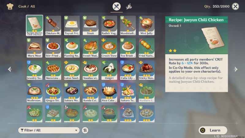 シェフ・マオからジュユン・チリ・チキンのレシピを購入した後、任意の調理場所に行き、調理メニューを開きます。ジュユン チリ チキン レシピを選択し、[学習] をクリックします。