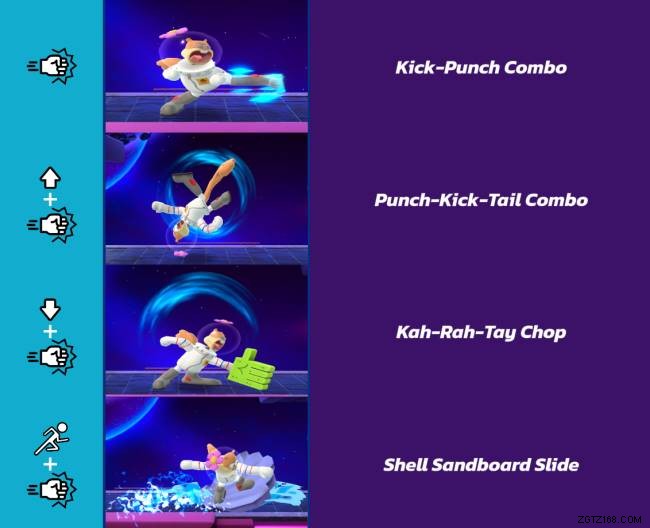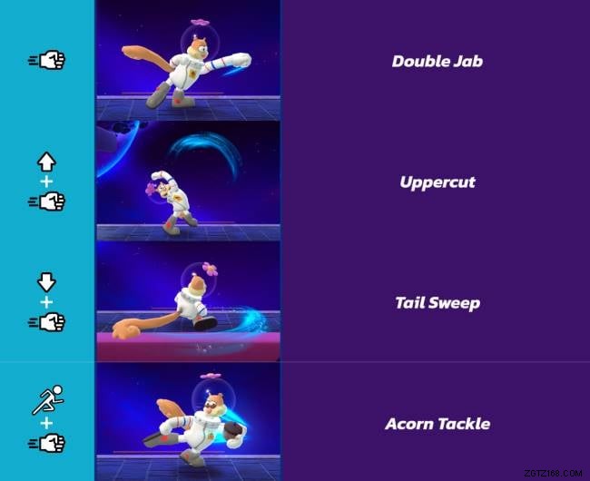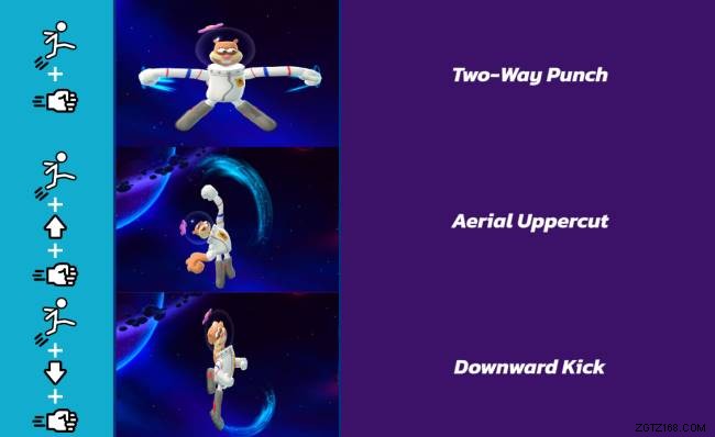 アッパーカット (10%):サンディが強力なアッパーカットを繰り出す。この技は軽攻撃で大ダメージを与えることができ、打ち上げの威力も高い。出てくるのが早いのでコンボのフィニッシャーとしてもいいし、素早ければ空中攻撃で追撃もできる。