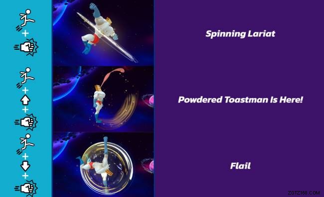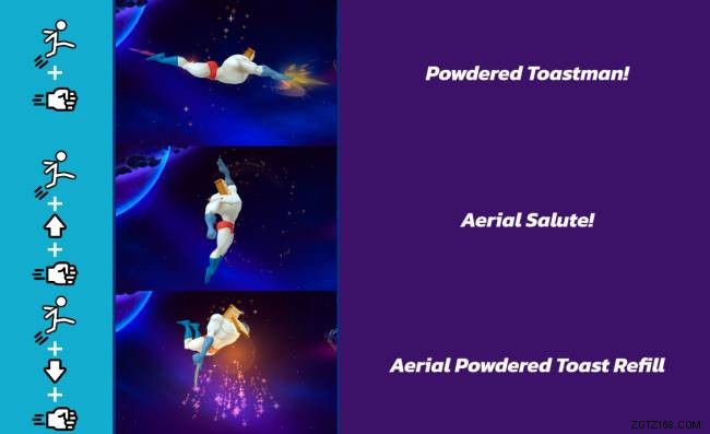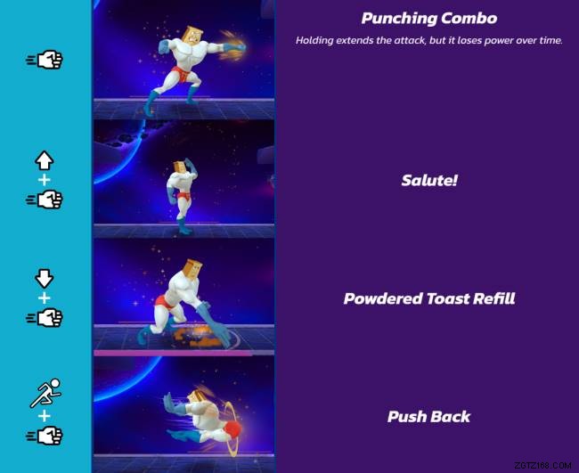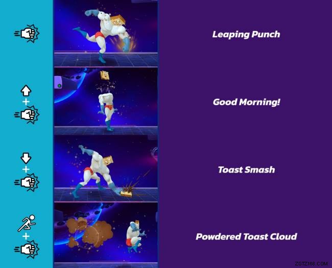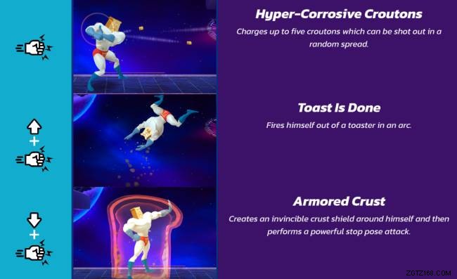 跳躍パンチ (17%):粉末状のトーストマンが前方に突進し、強力な打撃を与えます。突進はこの動きに少しの範囲を与えるので、対戦相手は不意を突かれるかもしれません.