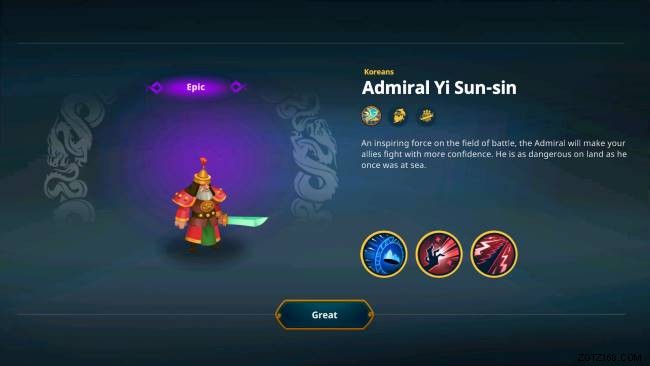 韓国は、李舜臣提督にアクセスできるため、国としても適しています。李舜臣は英雄の勇気で軍隊を結集させて戦いに臨む 、これにより、軍全体の統計が大幅に増加します。さらに、李舜臣は ヴァンパイア ブレイド で戦っているときに体力を盗む能力を持っています。 、彼に強い生存力を与えます。また、フン フンアプと同じように敵に流血を与えることもできるため、より多くのダメージを与えることができます。