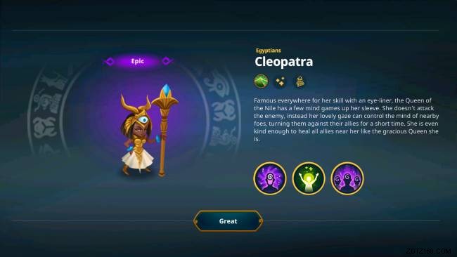 可憐でミステリアスなクレオパトラはエジプトの英雄であり、彼女のまばゆい魅力を駆使して敵を操ります。 マインドコントロール 対象の敵を数秒間味方に変えますが、これは多くの大混乱を引き起こすのに十分です. 分配への注意 一度に複数の敵を攻撃し、大量のスプラッシュ ダメージを与えます。