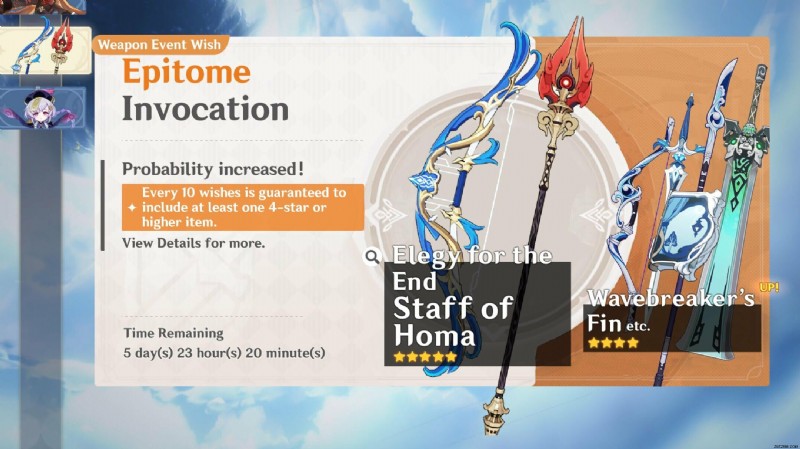 原神インパクト バージョン 2.2 アップデート、第 2 フェーズ、アップデートされた Epitome Invocation バナーには、Staff of Homa と Elegy of the End が再放送されます。どちらも人気の武器です。