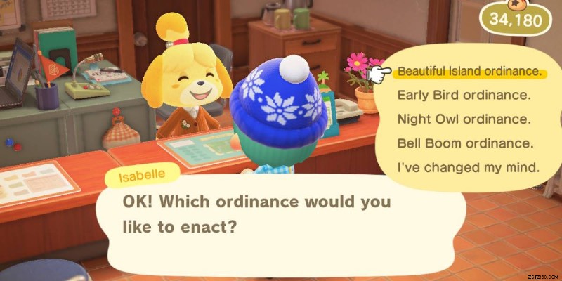 住民サービスで条例を設定できます。イザベルと話すと、条例は島の運営方法を変える「受動的効果」であることを簡単に説明してくれます。 「島の特徴を確認する」を選択してから、「条例について話し合う」を選択します。 20,000ベルかかります 条例を制定すると、翌日から有効になり、自分で無効にするまで続きます。試してみる条例は 4 つあります。ビューティフル アイランド、アーリー バード、ナイト フクロウ、ベル ブームです。