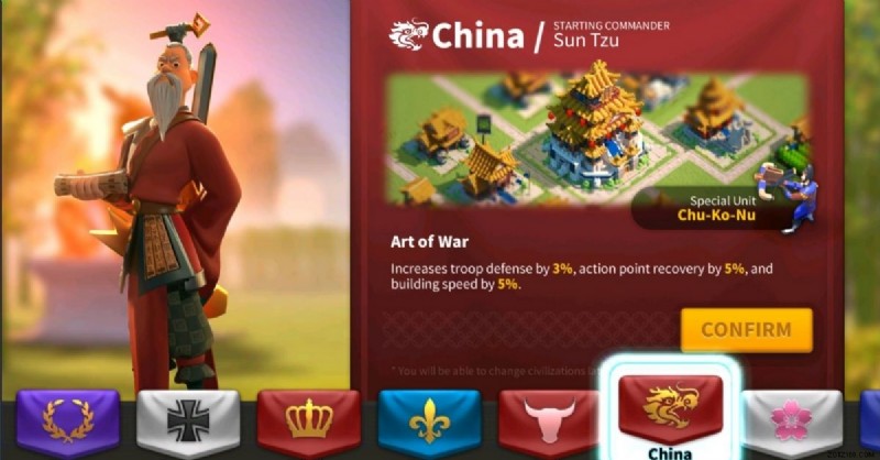 ゲーム序盤に最適な文明は中国 .これは、追加のアクション ポイントと、序盤のゲームに最適な指揮官を提供します。ただし、彼らの上位ユニットは良くないので、他の誰かを選びたいと思うかもしれません.また、序盤のゲームでは、日本としてプレイできます。 .ゲーム後半のピックは、使用したいユニットのタイプに基づいている必要があります。ローマ、バイキング、フランスは歩兵に適しています。オスマン帝国とイギリスは射手に大きなボーナスをもたらします。ドイツとビザンチウムは、騎兵で遊びたい場合に最適です。