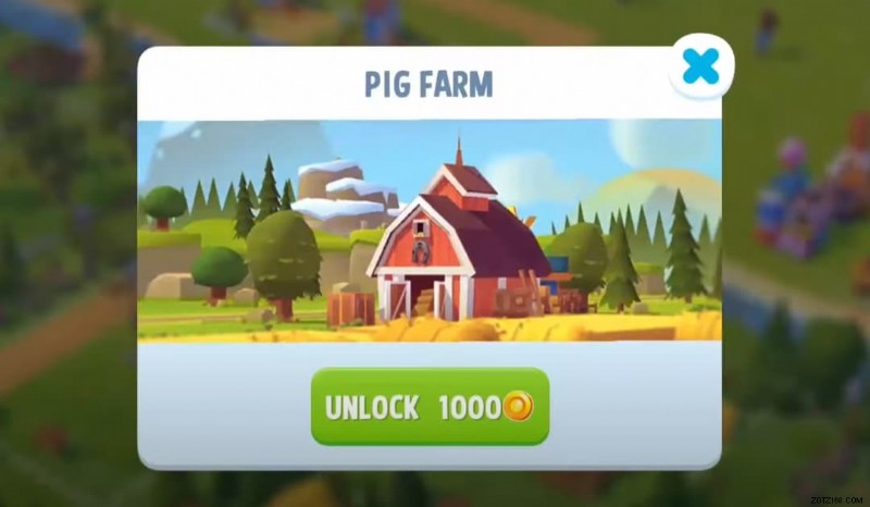 Pig Farm の拡張は、プレイヤーの農場の南側にあります。それをタップしてから、ロック解除をクリックします。 1,000 コインを持っていると仮定すると、Pig Farm 拡張の未構築バージョンのロックが解除されます。