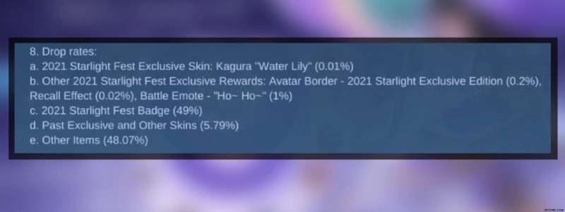 スターライト フェストは、プレイヤーが 2021 スターライト フェスト専用スキン、エモート、アバター ボーダーなどを描くことができるイベントの 1 つです。限定イベントの 1 つである Mobile Legends Bang Bang プレイヤーは、スターライト フェスト イベントに参加して景品を獲得する必要があります。現時点では、イベントはゲームに組み込まれています。詳細は次のとおりです。