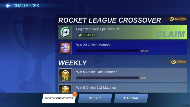 アカウントを接続すると、メイン メニューのチャレンジの横に通知が表示されます。チャレンジに移動すると、Epic アカウントでサインインしたために完了したロケット リーグ クロスオーバー チャレンジがあるはずです。それをタップして、無料のブラック マーケット Nuhai Inverted を請求します